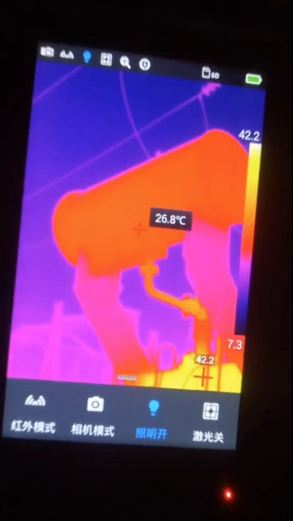 許龍將紅外測溫儀在五米開外對準油枕,一刻也不敢懈怠,僅5攝氏度的溫差,紅外圖譜顯示模糊,必須認真甄別,準確判斷油位。