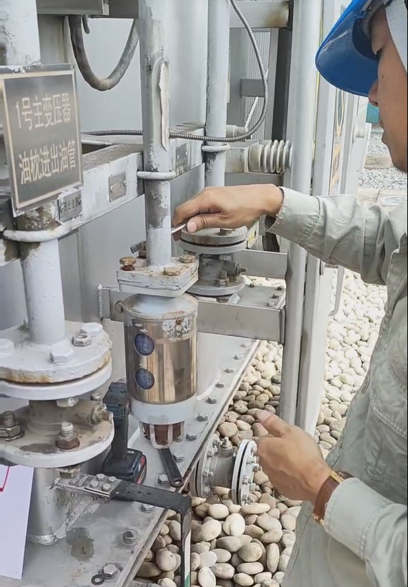 趙臺變電站1號主變壓器屬于油浸式變壓器,變壓器的內(nèi)部組件都“浸泡”在油中,絕緣油就相當于變壓器的“血液”,起到冷卻,絕緣的作用。變壓器的油位由油位計指示,油枕來調(diào)節(jié)。