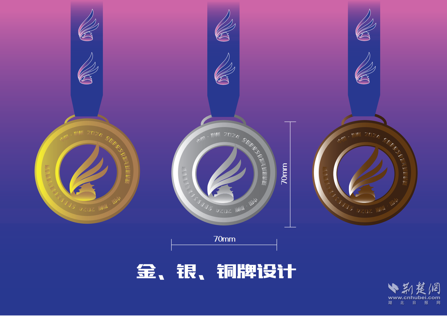 完賽獎牌將2024年至2026年的三塊獎牌拼在一起,構成整個完賽獎牌。獎牌整體設計以荊州古城墻為基底,采用三維拱形結構,簡約而大氣,充滿力量感與動態(tài)美,既是對荊州古城墻的致敬又完美地契合了體育競技精神。