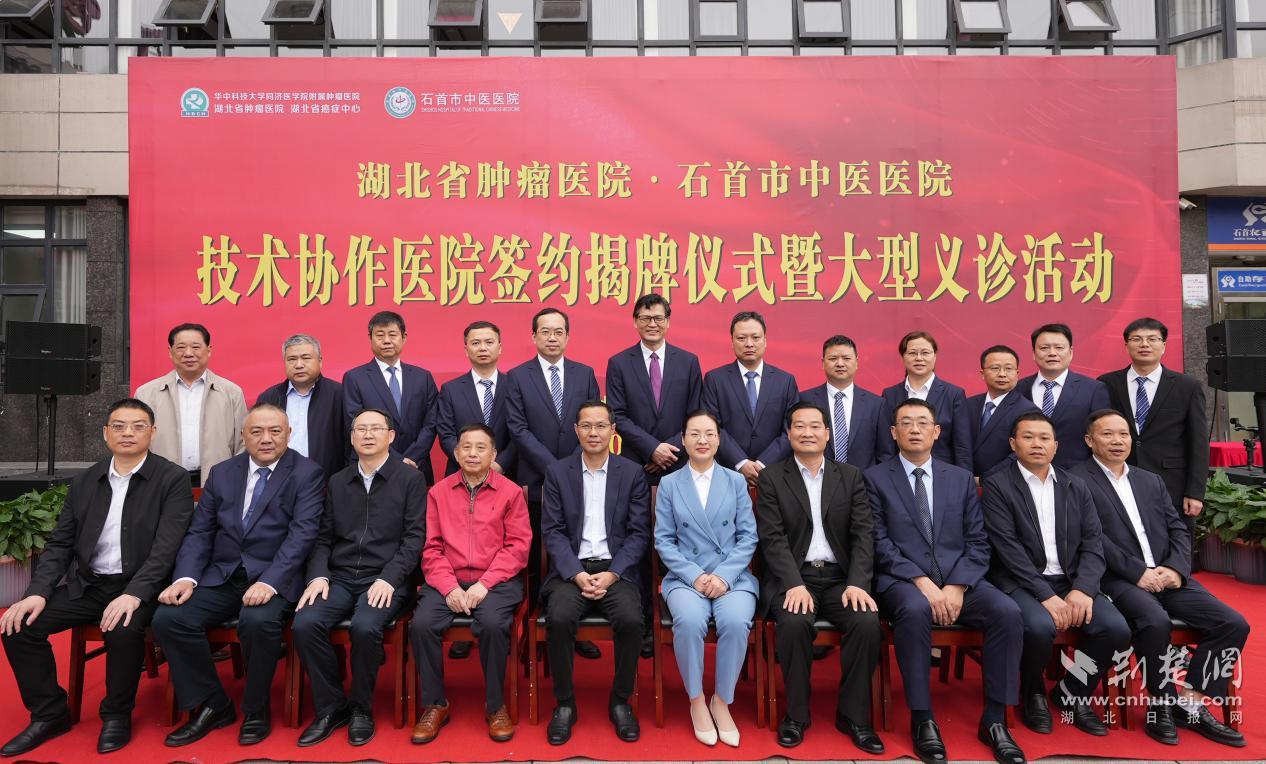 湖北省腫瘤醫(yī)院黨委書記鄭正春及專家團(tuán)隊(duì),石首市人民政府副市長(zhǎng)白卉,市人民政府辦公室聯(lián)線主任李金福,市衛(wèi)健局黨組書記、局長(zhǎng)李強(qiáng),市衛(wèi)健局財(cái)務(wù)監(jiān)管中心主任、醫(yī)政分管領(lǐng)導(dǎo)王石平,市中醫(yī)醫(yī)院黨委書記汪譽(yù)新,市中醫(yī)醫(yī)院黨委副書記、院長(zhǎng)彭勇及班子成員出席簽約揭牌儀式。儀式由李金福主持。