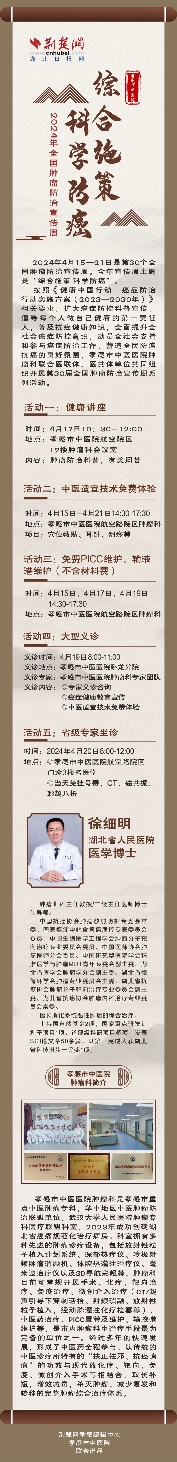 2024年4月15—21日是第30個(gè)全國(guó)腫瘤防治宣傳周,今年的主題是“綜合施策 科學(xué)防癌”。孝感市中醫(yī)院腫瘤防治宣傳周系列活動(dòng)開(kāi)啟,健康講座、大型義診、中醫(yī)適宜技術(shù)免費(fèi)體驗(yàn)、更有省級(jí)專家坐診,一起來(lái)了解一下吧!