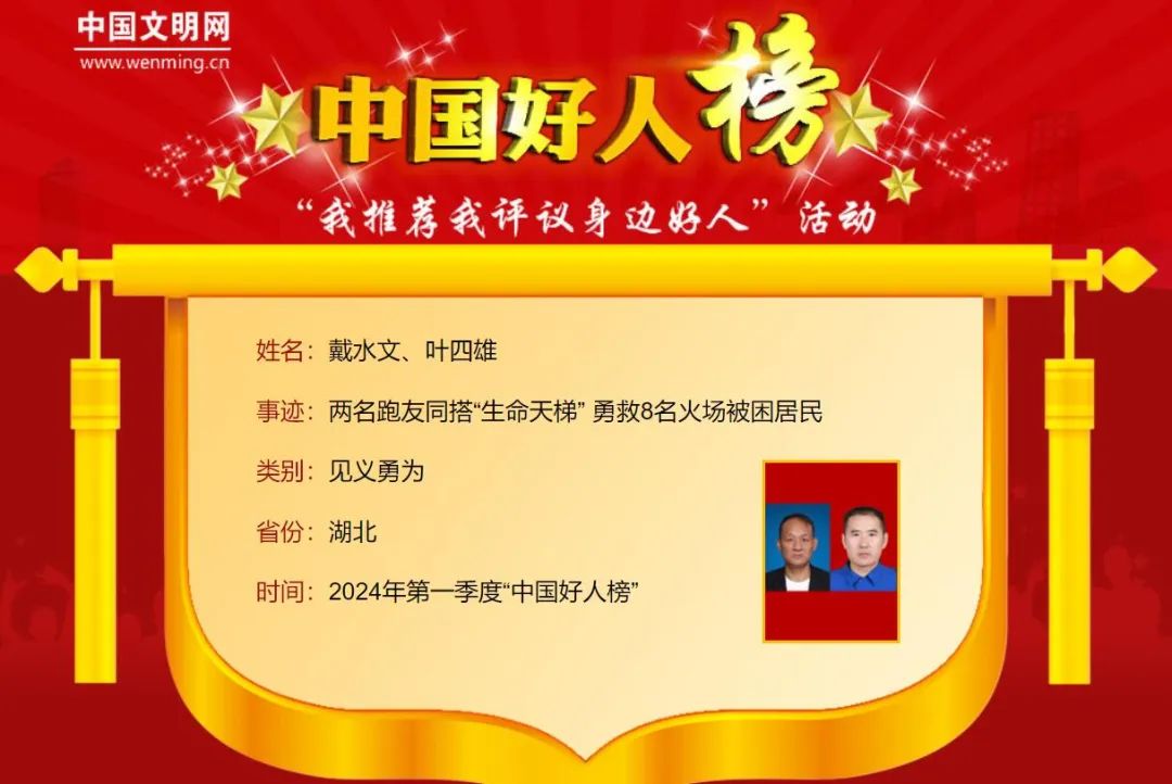 4月18日,2024年第一季度“中國好人榜”發(fā)布儀式暨全國道德模范與身邊好人現場交流活動在江西省九江市舉辦,湖北省共有9人(組)上榜。其中,荊州監(jiān)利市跑友戴水文、葉四雄當選“見義勇為”類中國好人。