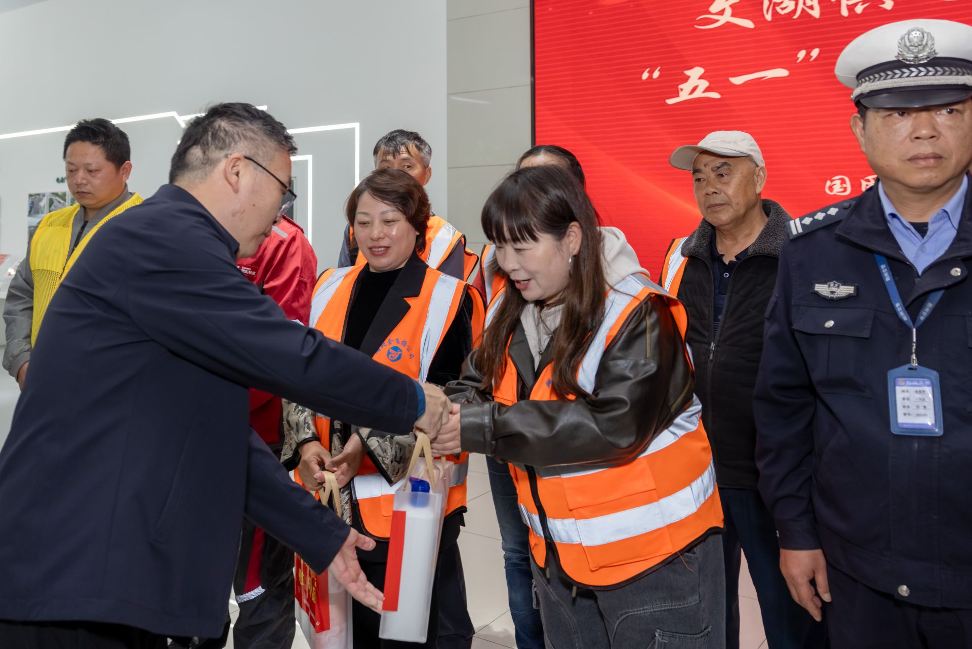 在愛心驛站內(nèi),郭立和陳勇與各行業(yè)勞動者們面對面交流,為他們發(fā)放慰問品,并向他們送上誠摯的節(jié)日問候和衷心的感謝。