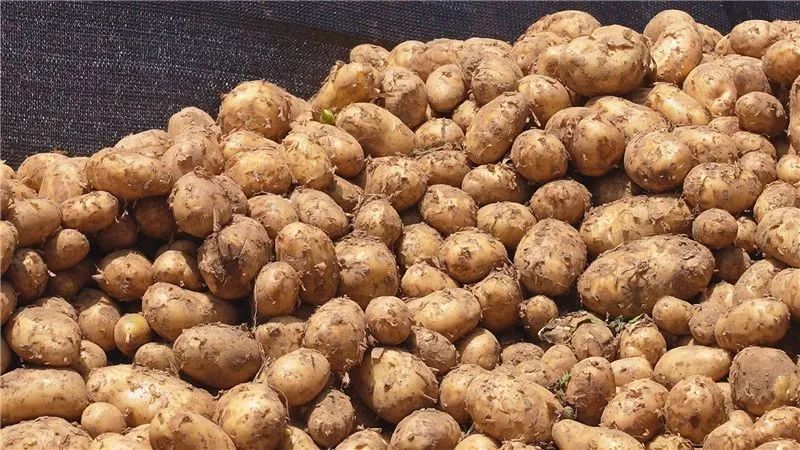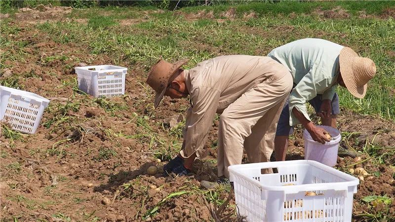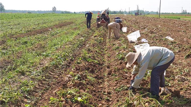 村民們彎著腰緊跟其后,快速分揀、裝袋,滿載的運(yùn)輸車輛直接將新鮮的土豆送至市場。