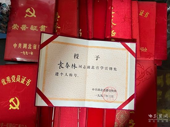 面對外界的種種聲音,老兵袁春林充耳不聞,只有幾個塑料袋里新舊不一的一摞摞證書和墻上的錦旗,無聲訴說著他的信念和堅守。