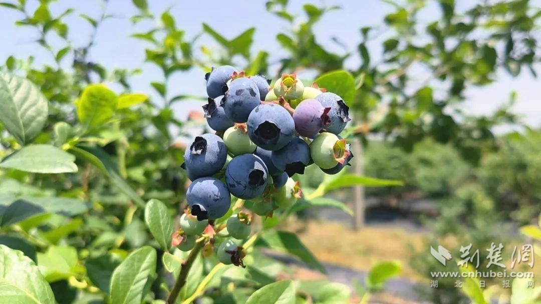 5月17日上午,在孝昌縣衛(wèi)店鎮(zhèn)佳地藍莓家庭農場,只見半人高的藍莓樹排列整齊,飽滿多汁的藍莓果掛滿枝頭,成熟的紫色果實在陽光的照耀下格外搶眼。
