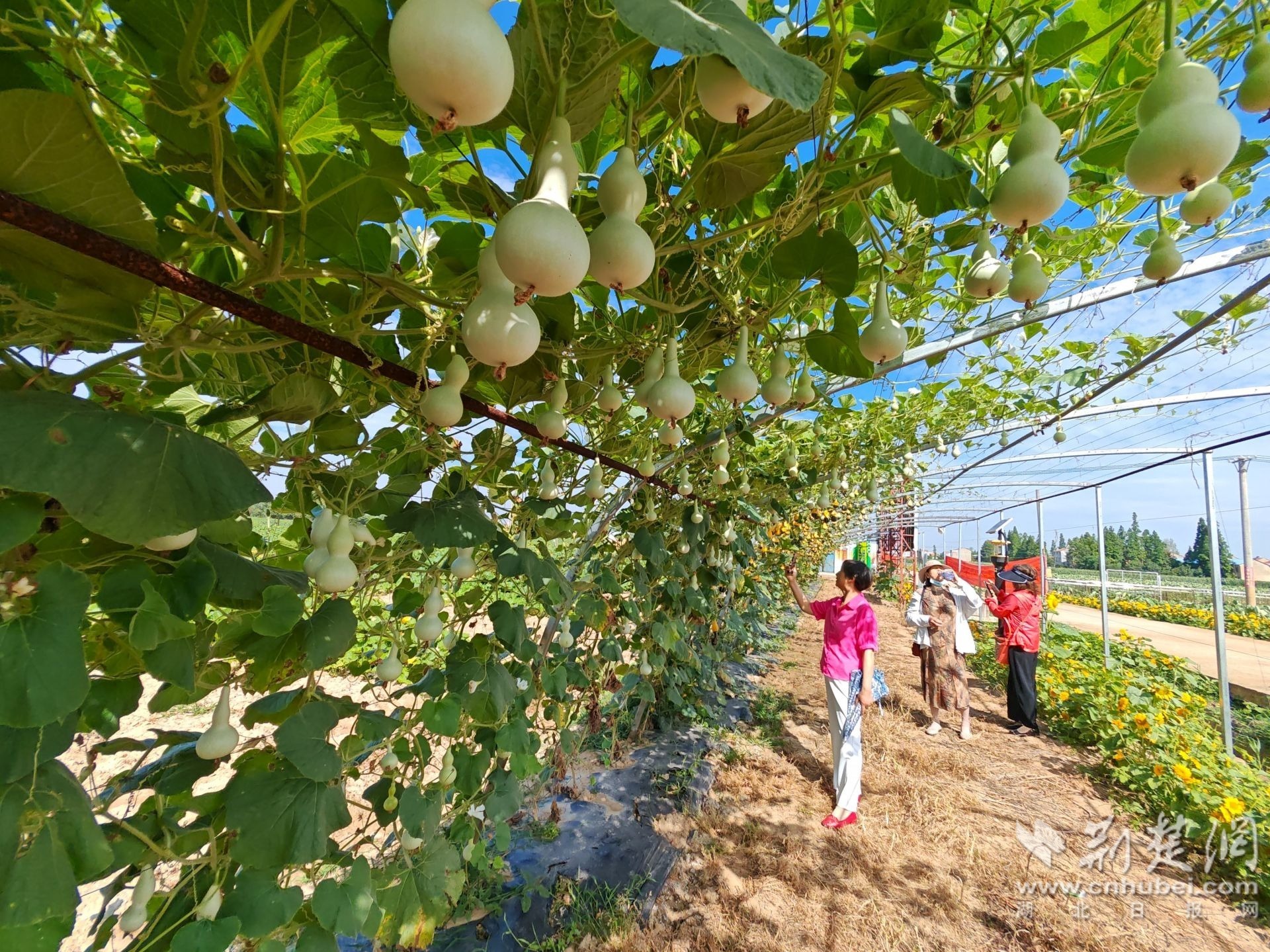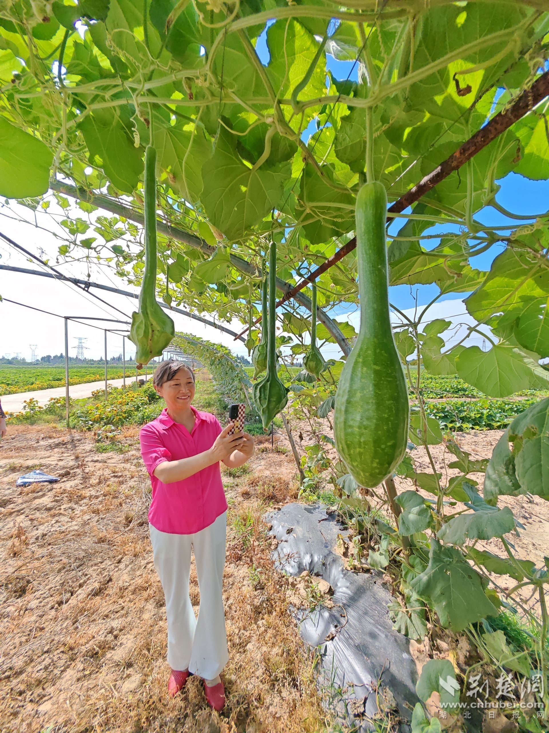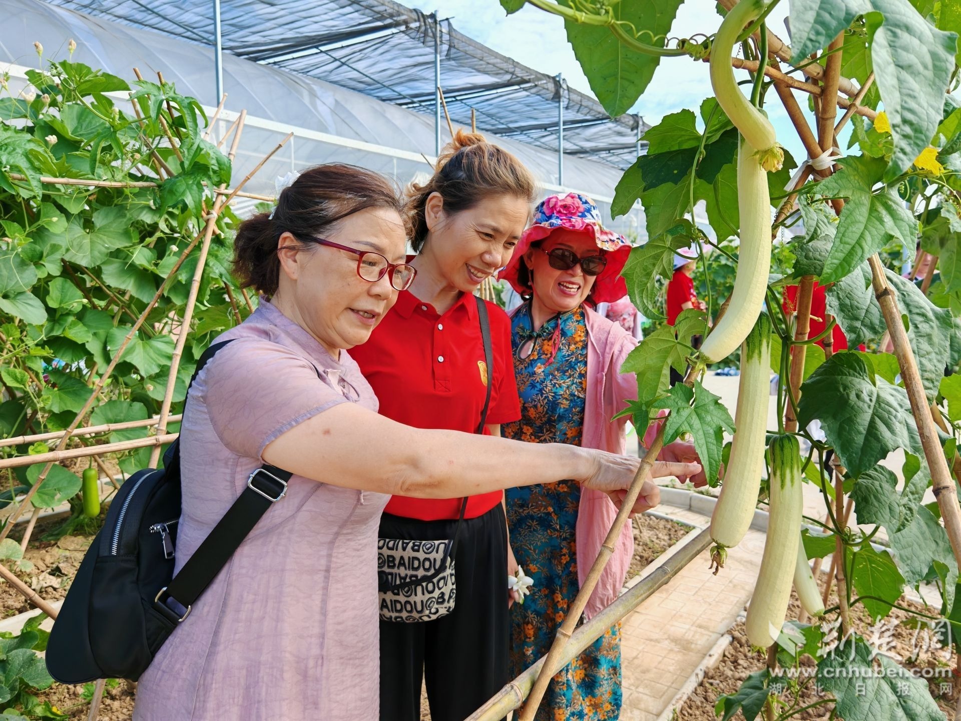 這些遠(yuǎn)道而來的客人,首先到四季長青蔬菜種植專業(yè)合作社便民服務(wù)站觀看擺放的各種葫蘆、南瓜,到科普基地觀看奇果異瓜,到幼苗工廠觀看無土栽培,到田頭觀看連體架上生長的“鴛鴦梨”“鶴首”“迷你葫蘆”,又到“每之文農(nóng)場”的荷花池邊觀賞荷花,有的還登上拖拉機(jī)駕駛室體驗(yàn)農(nóng)耕生活,還有的則到菜地采摘新鮮的茄子、莧菜、黃瓜等蔬菜。大家在稀奇古怪的葫蘆地、綠油油的菜地、整齊的甘蔗苗地以及漂亮的荷花池邊觀賞拍照,流連忘返。