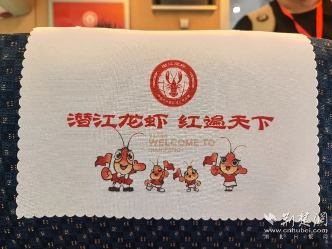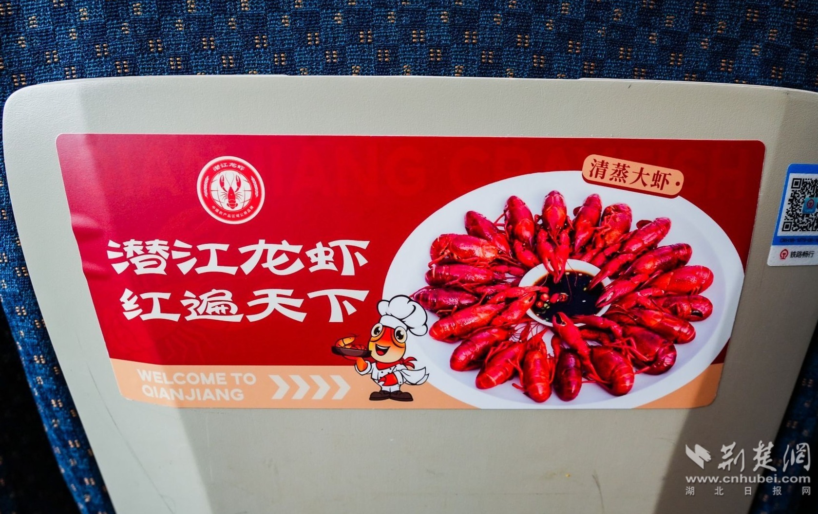 在專列車廂內(nèi),門貼、海報(bào)、行李架、頭枕巾、桌貼、滾動屏……每一處都充滿了“潛江龍蝦”元素,共同構(gòu)建了一個全方位、沉浸式的場景,營造出一個品牌“移動展廳”,立體化展現(xiàn)了潛江龍蝦的形象與優(yōu)勢。