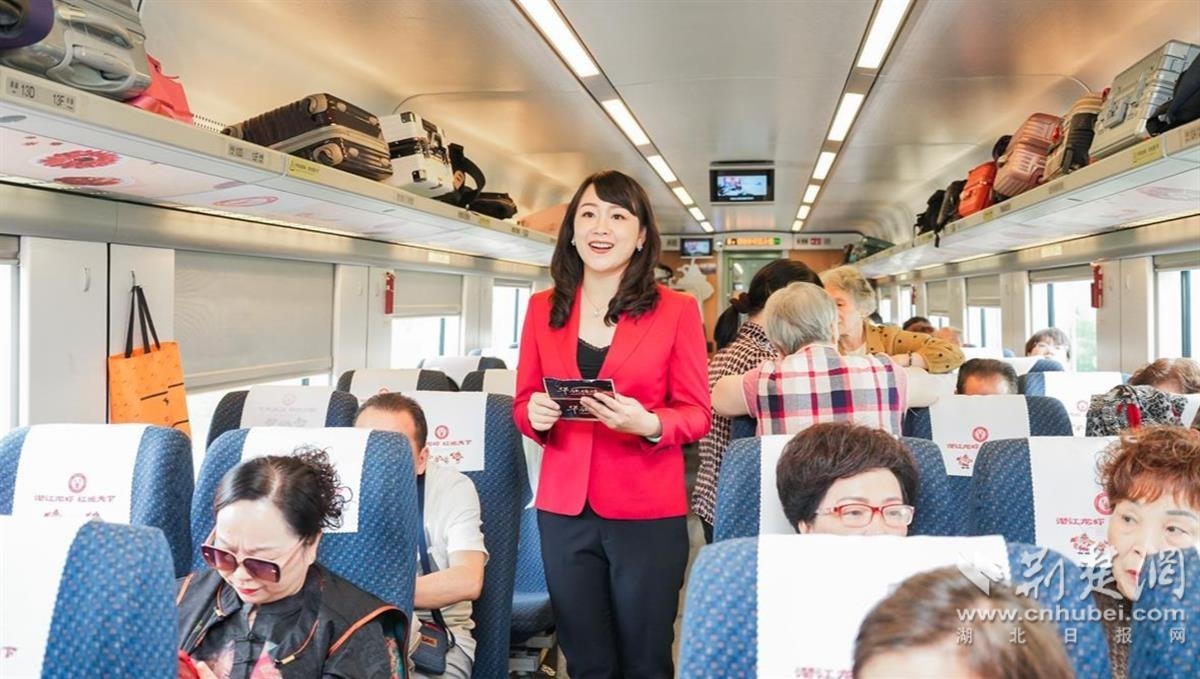 列車啟動后,窗外的風(fēng)景迅速后退,一場別開生面的有獎問答活動在車廂內(nèi)展開。乘客們踴躍參與,搶答關(guān)于“潛江龍蝦”的問題,為枯燥的旅行增添了一些趣味。