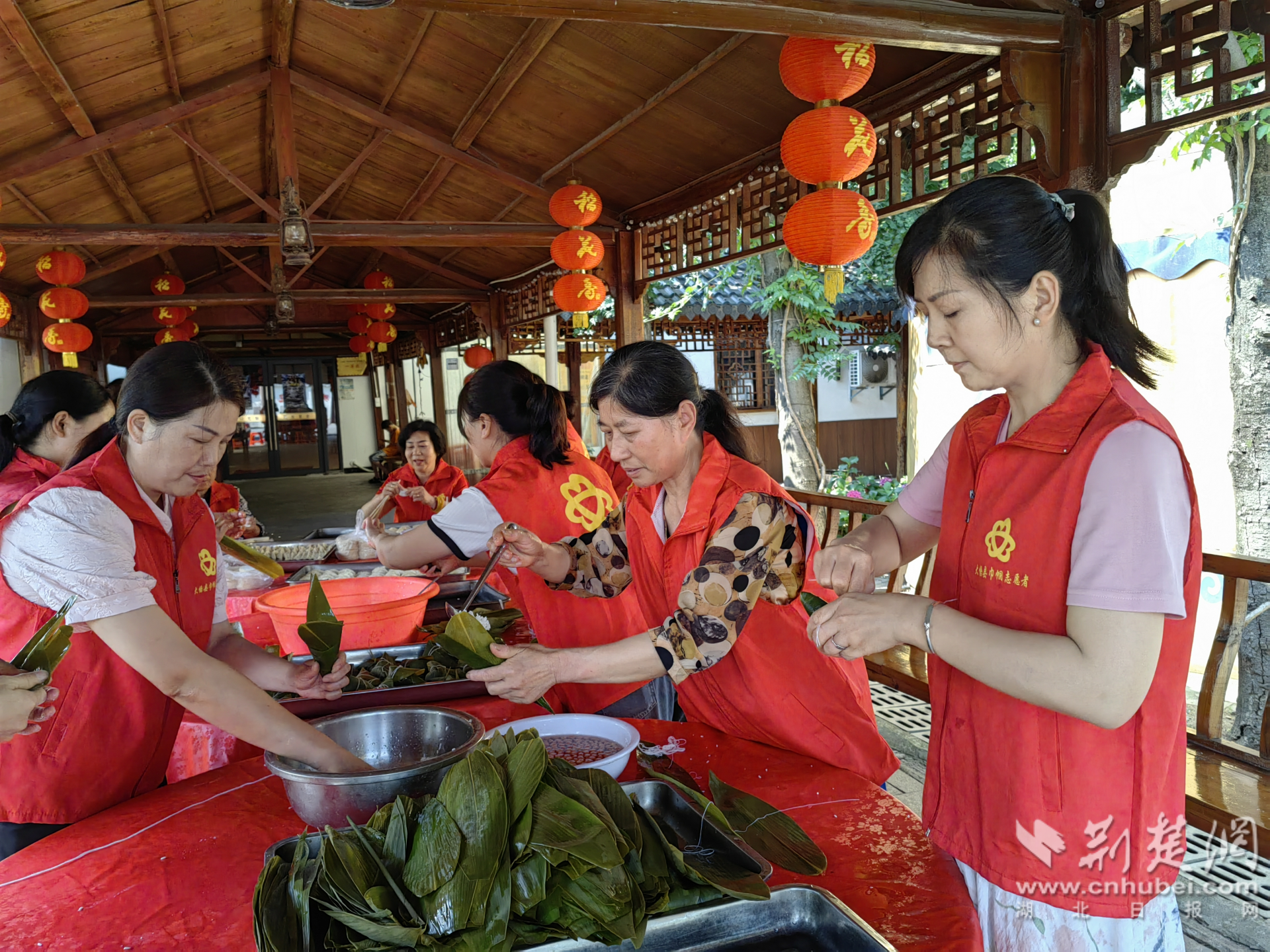 一盆盆新鮮的糯米,一雙雙靈巧的手。只見志愿者們手拿打好的粽葉,把它彎成一個漏斗狀,填上糯米,再來兩個棗,剩下的這端往回一折,繩子一繞,一片片粽葉瞬間變成了一個個有棱有角的粽子。整個食堂里彌漫著沁人心脾的粽香,現(xiàn)場一片歡聲笑語,其樂融融,快樂而溫馨。