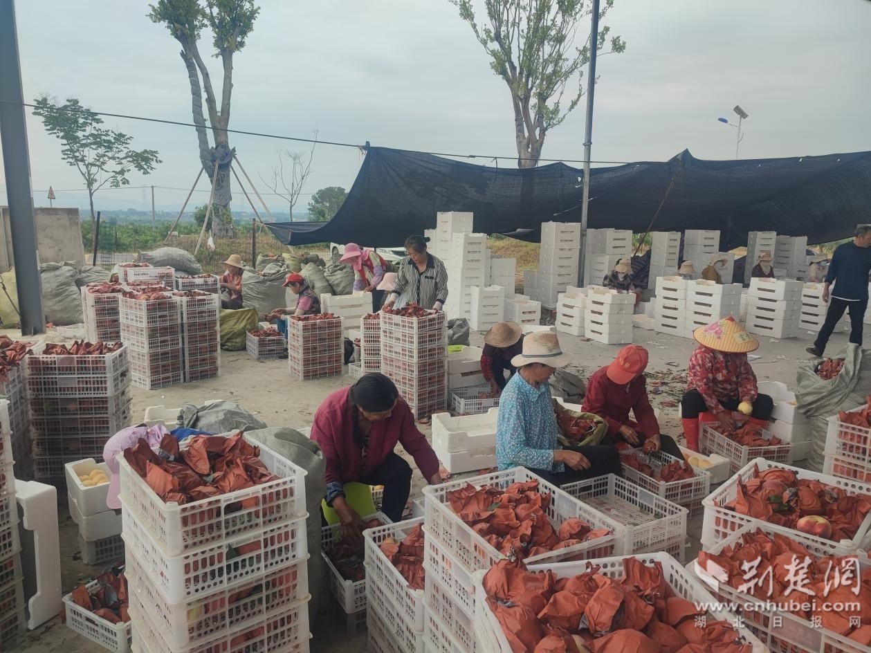 桃園內(nèi),桃農(nóng)們正忙著將清晨摘下的桃子進(jìn)行稱重、裝箱。眼下,全國(guó)各地瓜果飄香。在楊店鎮(zhèn),萬(wàn)畝桃園陸續(xù)成熟。清脆可口、香甜多汁的桃也成為當(dāng)?shù)氐奶厣止瑤?dòng)農(nóng)戶增收。