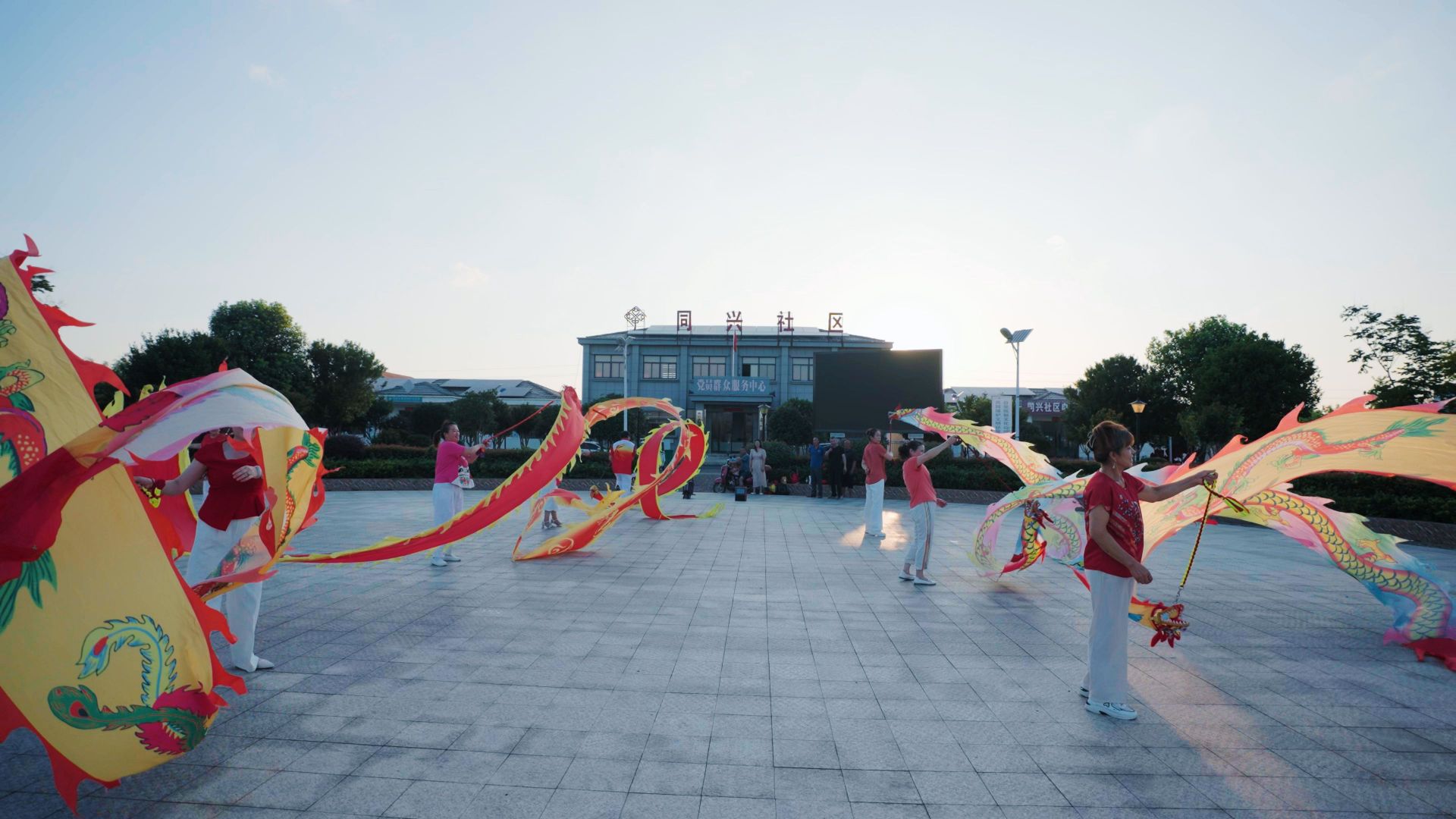 居民在同心社區(qū)黨員群眾服務(wù)中心門(mén)口舞龍