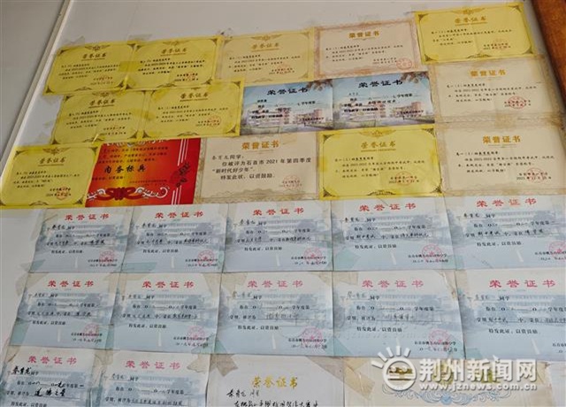 秦育龍家住石首市桃花山鎮(zhèn)吳家垱村,走進他家,最吸引眼球的是整整一墻的獎狀。從小秦育龍的學(xué)習(xí)成績就非常優(yōu)異,是其他父母口中“別人家的孩子”,2021年他以第一名的成績從桃花鎮(zhèn)初級中學(xué)考入石首一中,高中三年,成績一直名列前茅,并擔任班級團支書,被評為學(xué)校第一屆陽光自主學(xué)子,還榮獲荊州市2022年第一季度“新時代好少年”稱號。