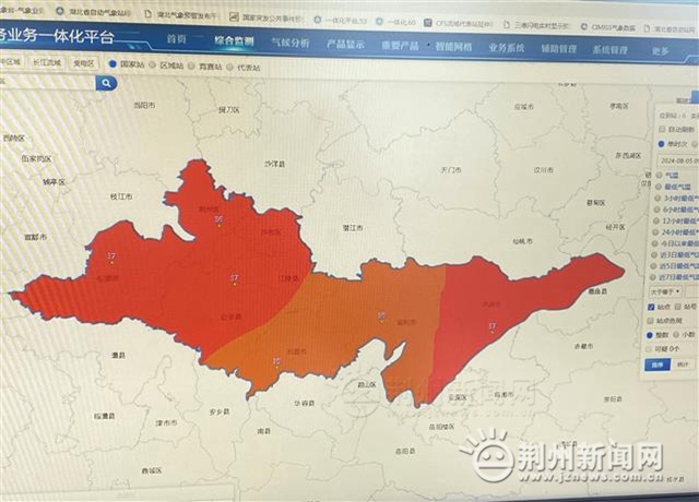 7月1日至8月4日,荊州市6個(gè)國(guó)家氣象站監(jiān)測(cè)平均氣溫平均值為30.4℃,較歷史同期偏高1.6℃,最高氣溫平均值為34.2℃,較歷史同期偏高1.6℃。各站高溫日數(shù)大于35℃,8—18天,除監(jiān)利基本持平外,其余各站較常年偏多3-7天。各站高溫日數(shù)大于37℃,3—7天,較常年偏多1—5天。