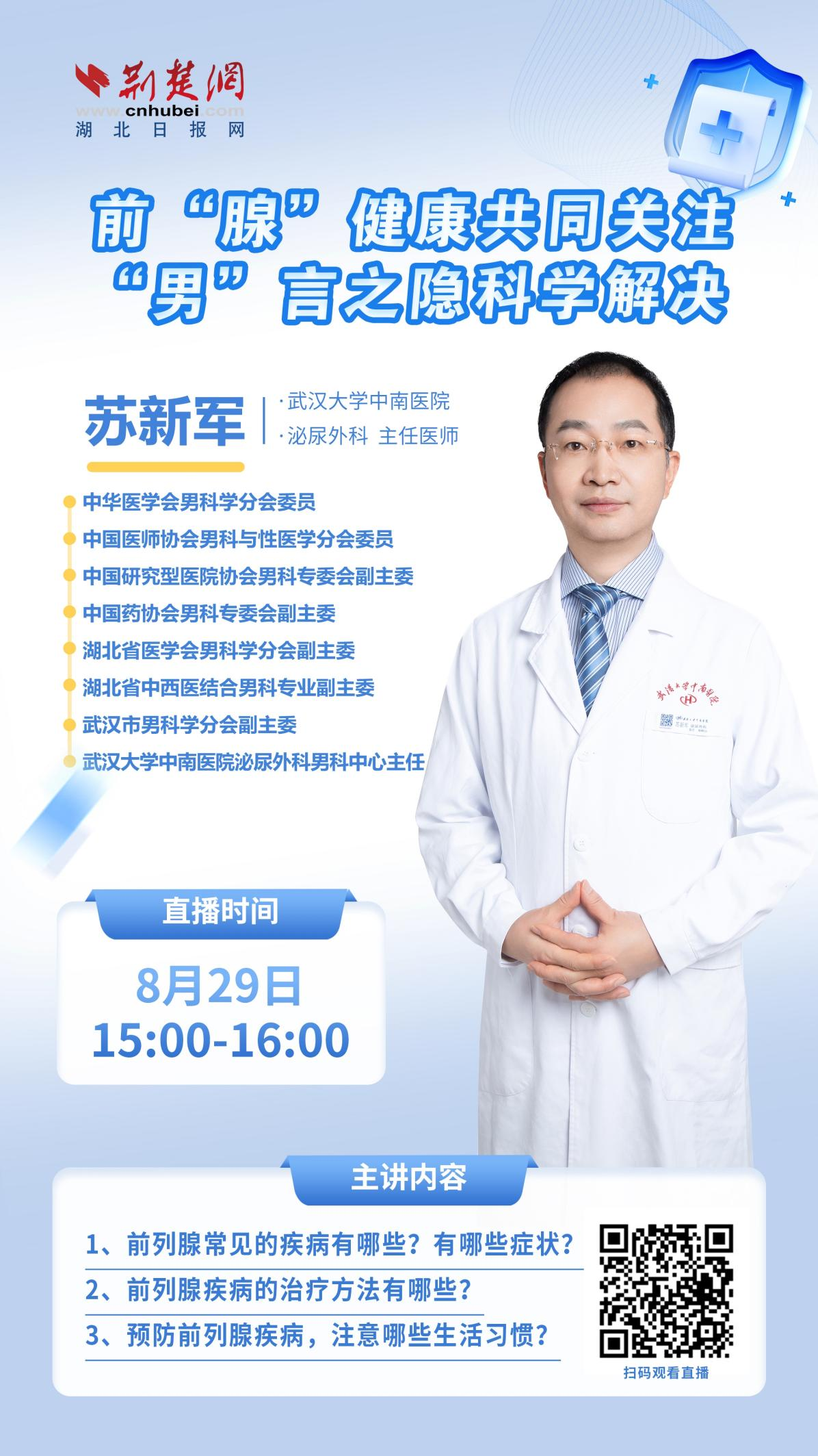 8月29日,荊楚網《名醫(yī)話健康》欄目邀請了武漢大學中南醫(yī)院泌尿外科男科中心主任、主任醫(yī)師蘇新軍為大家詳細解讀前列腺疾病的成因、癥狀、預防和治療等方面的知識。