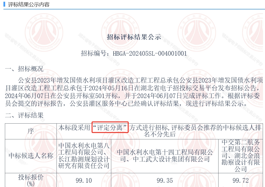 近日,公安縣首個(gè)采用“評(píng)定分離”辦法招標(biāo)的水利工程施工項(xiàng)目——公安縣2023年增發(fā)國(guó)債水利項(xiàng)目灌區(qū)改造工程在縣公共資源交易中心順利完成定標(biāo)工作,此項(xiàng)工作是公安縣水利建設(shè)領(lǐng)域采用新招投標(biāo)模式的一次成功嘗試,同時(shí)為該領(lǐng)域“評(píng)定分離”的落地實(shí)施邁出了扎實(shí)的一步,得到了各方市場(chǎng)主體的一致好評(píng)。