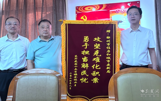 荊楚網(wǎng)(湖北日?qǐng)?bào)網(wǎng))訊(記者王焱堯)攻堅(jiān)克難化積案,勇于擔(dān)當(dāng)解民憂。8月30日上午,鄂州市東升花園小區(qū)15號(hào)樓業(yè)主代表周克東、胡德江給鄂州市住更局送去一面錦旗。