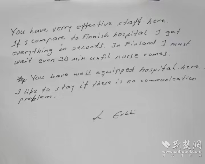 荊楚網(wǎng)(湖北日?qǐng)?bào)網(wǎng))訊(記者葉修頎 通訊員袁曼)9月8日,孝感市中心醫(yī)院呼吸與危重癥醫(yī)學(xué)科II病區(qū)的芬蘭患者羅斯塔蒂克在出院之際,留下了一封手寫(xiě)感謝信,雖短短數(shù)語(yǔ),卻是他由衷的感謝,字里行間,真情流露。
