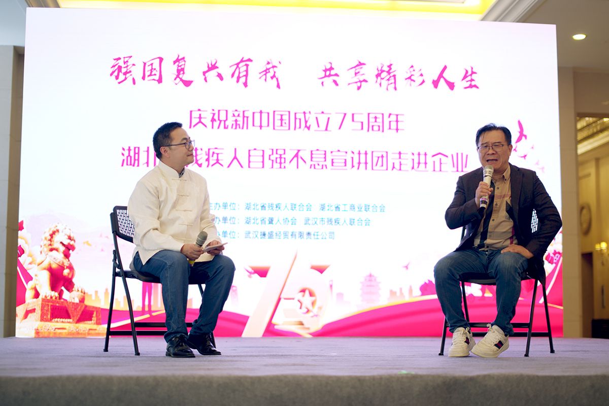 在此次宣講活動中,來自武漢市第一聾啞學(xué)校的演員們表演的舞蹈《千手觀音》,讓大家重溫了2005年春晚的精彩一幕;1位盲人和4位聾人代表表演的手語歌《我和我的祖國》引發(fā)全體人員大合唱,場面非常感人。來自武漢艾格美康復(fù)器材有限公司董事長、武漢市肢協(xié)副主席、洪山區(qū)肢協(xié)主席李娟,武漢市新洲區(qū)特殊教育學(xué)校老師、湖北省聾協(xié)主席李磊,湖北省殘疾人游泳隊運動員、東京殘奧會、巴黎殘奧會冠軍、中國五四青年獎?wù)芦@得者袁偉譯,作為自強(qiáng)不息宣講代表紛紛登臺,分享了他們的奮斗故事和人生感悟,用自己的親身經(jīng)歷詮釋了 “自尊、自信、自強(qiáng)、自立” 的精神,深深打動了在場的每一個人。