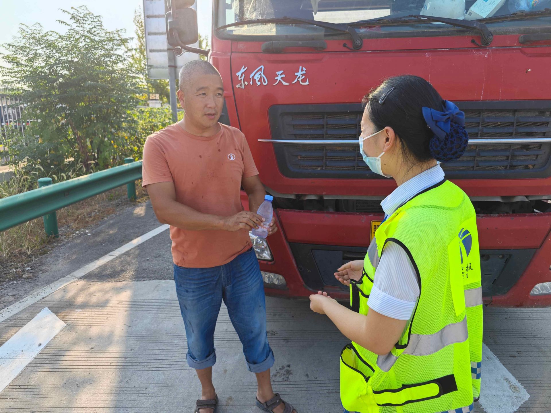 解危助困,溫暖相隨。9月29日下午15:00時許,一輛五軸貨車駛?cè)肽掀绞召M站入口廣場后突發(fā)故障無法行駛,正好被廣場巡邏的收費班長姚思思發(fā)現(xiàn)。面對這一緊急情況,姚思思當(dāng)機立斷,安排入口收費員在車道前對上站車輛進(jìn)行疏導(dǎo)管控,同時幫忙聯(lián)系附近汽修廠,并在車輛后方擺放了標(biāo)志桶。在維修的過程中,收費站還積極提供必要的修車工具并進(jìn)行協(xié)助維修,一個小時后車輛恢復(fù)了正常。“謝謝,今天可多虧了你啊,我一個人真的不知道該怎么辦才好,太感謝你了!”這一暖心之舉不僅解決了司乘的困境,也讓過往的司乘人員深刻感受到了高速公路上的人文關(guān)懷。