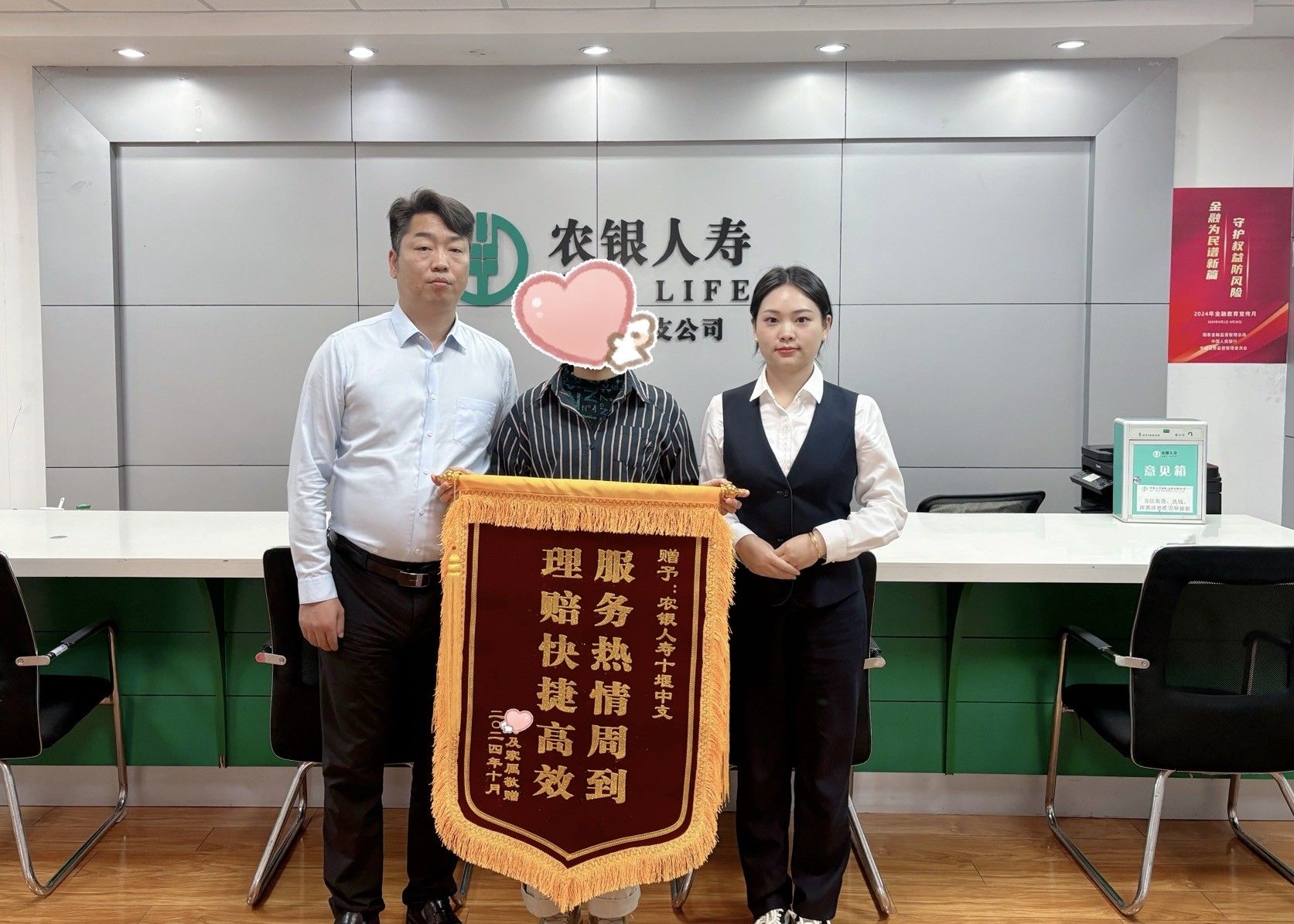 2024年10月8日,客戶家屬親自將印有“服務(wù)熱情周到 理賠快捷高效”的錦旗送到十堰中支,并再次表達(dá)了對(duì)公司高效、熱情服務(wù)的感謝。