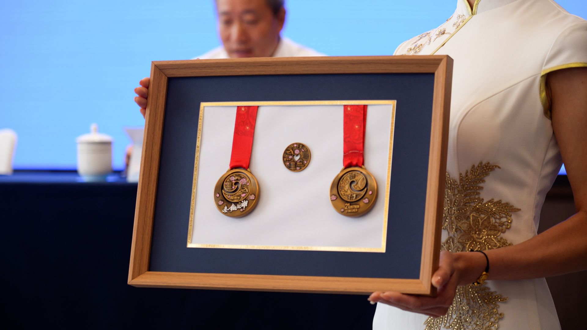 10月17日上午,孝感市召開第二次新聞發(fā)布會(huì),公布賽事規(guī)格、參賽選手和賽事籌備等情況,并發(fā)布本屆賽事的獎(jiǎng)牌和服裝設(shè)計(jì),現(xiàn)場(chǎng)還為賽事贊助商進(jìn)行了授牌。
