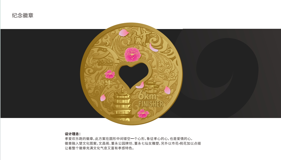 本次完賽獎(jiǎng)牌和參賽服裝設(shè)計(jì)巧妙融合了楚文化圖案、文昌閣、董永七仙女雕塑、董永公園牌坊、浪漫桃花等孝感元素,凸顯“孝文化”主題。