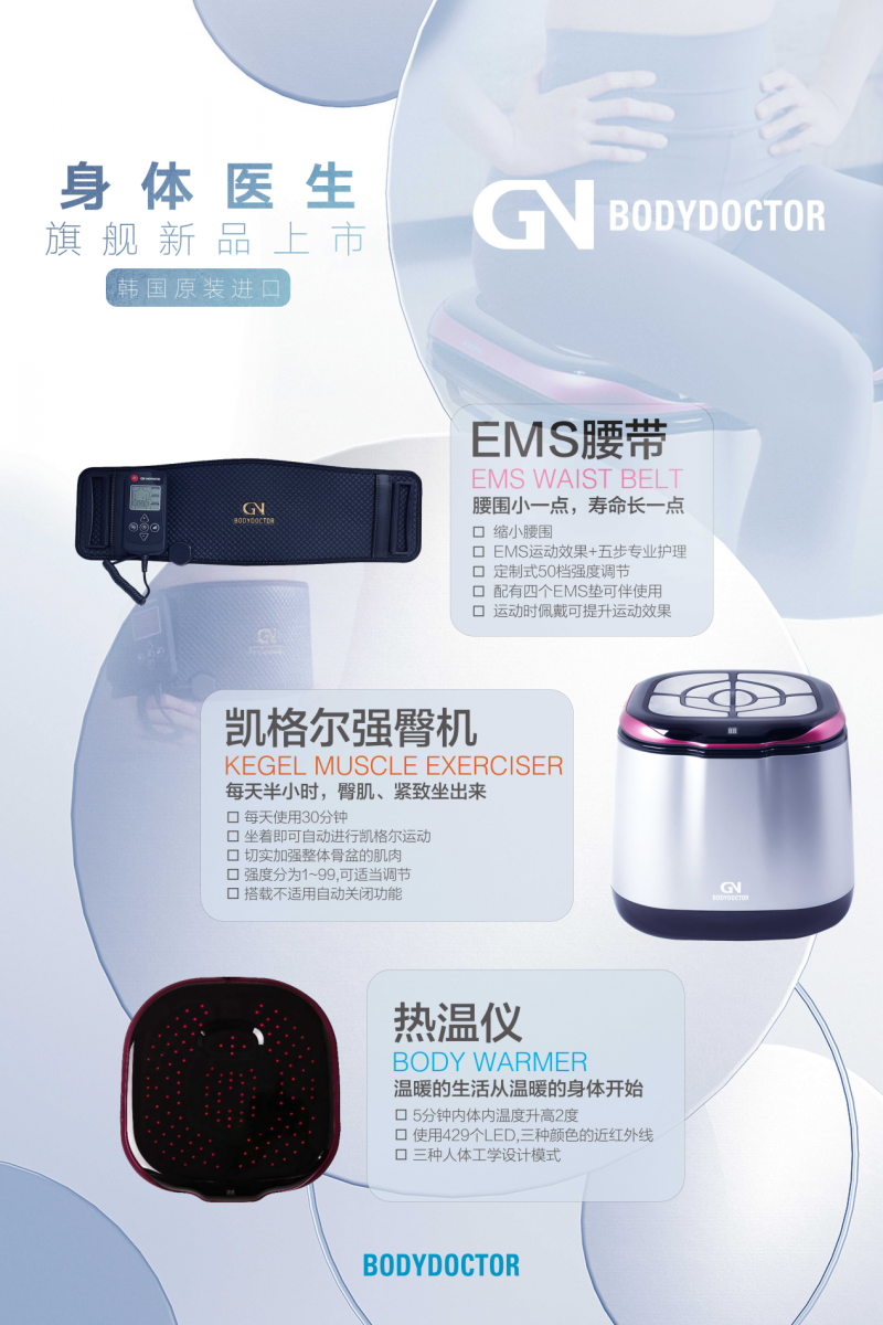 據(jù)了解,凱格爾強(qiáng)臀機(jī)、溫?zé)醿x和EMS腰腹帶等GN身體醫(yī)生系列產(chǎn)品不僅暢銷韓國(guó),在日本和美國(guó)市場(chǎng)也贏得廣泛贊譽(yù)。凱格爾強(qiáng)臀機(jī),每天30分鐘,坐著就可以自動(dòng)進(jìn)行凱格爾運(yùn)動(dòng)。凱格爾運(yùn)動(dòng)是哈佛大學(xué)推薦的五種對(duì)身體有益的運(yùn)動(dòng)之一,可以有效收縮和放松盆底肌和臀部肌肉。溫?zé)醿x利用近紅外線和 LED(紅色、藍(lán)色)獲得坐浴的效果,坐浴可以改善血液循環(huán)、膀胱和生殖器疾病,促進(jìn)減肥和新陳代謝,預(yù)防便秘和痔瘡,提高體內(nèi)溫度和免疫力。EMS腰腹帶,內(nèi)置5種獨(dú)家特殊訓(xùn)練程序,對(duì)腹部和肋部等腰部有效傳達(dá)電流刺激。研究表明,佩戴后運(yùn)動(dòng)20分鐘左右,相當(dāng)于約6個(gè)小時(shí)常規(guī)運(yùn)動(dòng)效果。