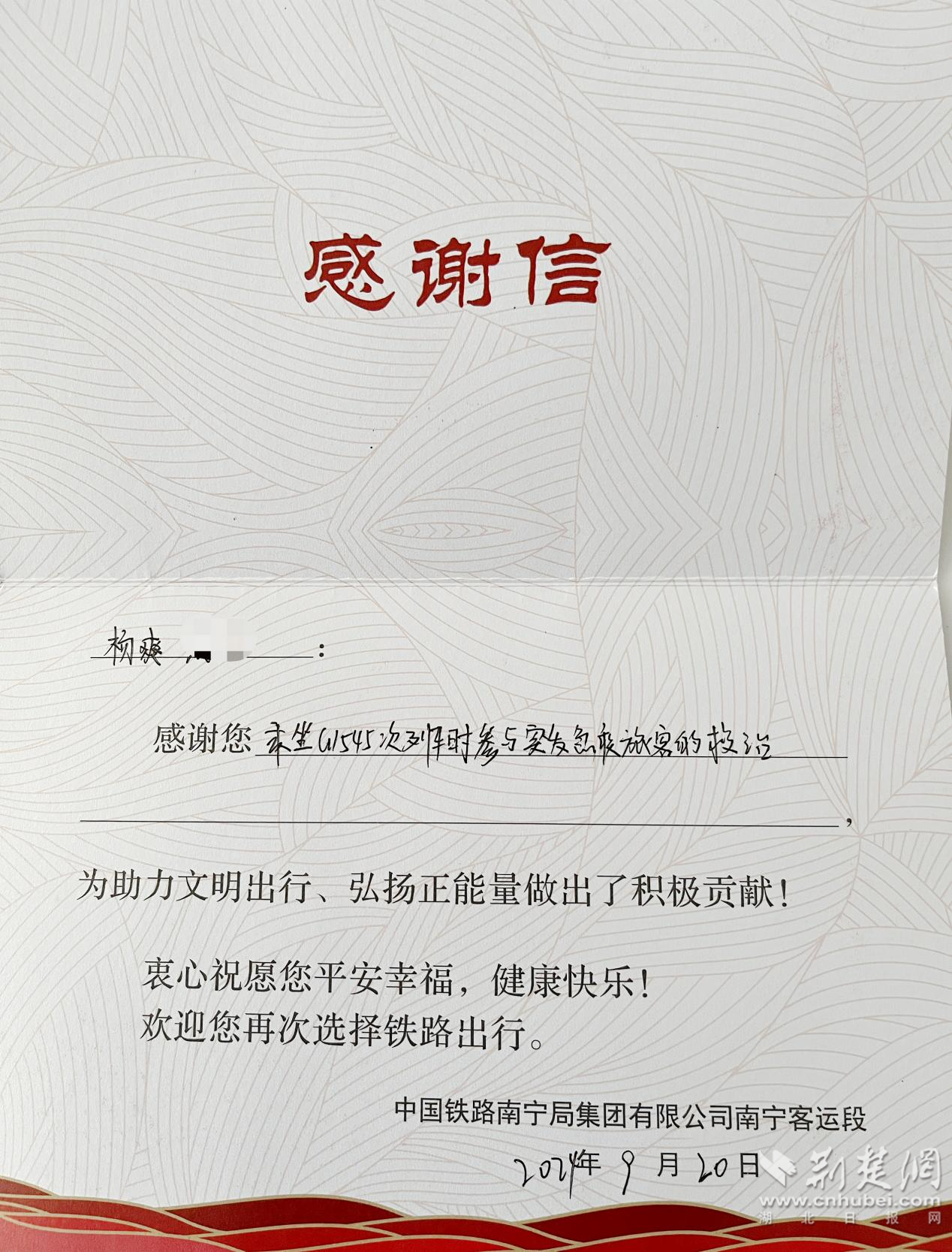 荊楚網(wǎng)(湖北日?qǐng)?bào)網(wǎng))訊(記者葉修頎 通訊員羅津)10月19日,孝感市中心醫(yī)院骨科Ⅱ脊柱病區(qū)醫(yī)生楊爽收到了一份特殊的禮物——一封來自中國鐵路南寧局集團(tuán)有限公司南寧客運(yùn)段的感謝信以及一款“鐵潮”文創(chuàng)背包,以感謝他的一次緊急救助行動(dòng)。