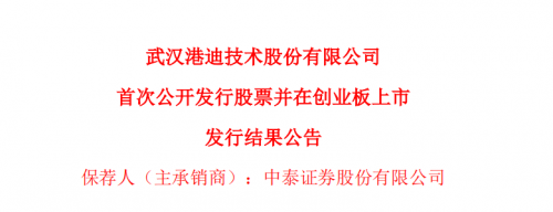 武漢港迪技術(shù)股份有限公司于近日首次公開發(fā)行股票并在創(chuàng)業(yè)板上市發(fā)行結(jié)果公告,股票簡稱為“港迪技術(shù)”,股票代碼為“301633”。本次發(fā)行的保薦人(主承銷商)為中泰證券股份有限公司。