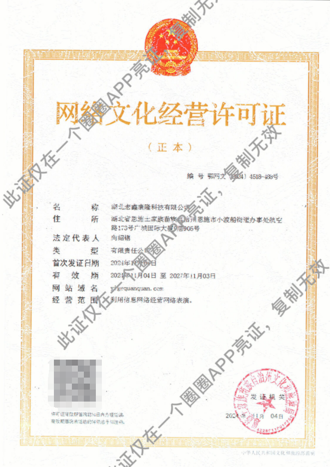 網(wǎng)絡(luò)文化經(jīng)營(yíng)許可證的獲得,意味著湖北宏鑫康隆科技有限公司正式具備了經(jīng)營(yíng)網(wǎng)絡(luò)文化業(yè)務(wù)的合法資質(zhì),可以依法合規(guī)地在全國(guó)范圍內(nèi)開展網(wǎng)絡(luò)表演等活動(dòng)。這將為湖北宏鑫康隆科技有限公司進(jìn)一步拓寬數(shù)字互聯(lián)網(wǎng)業(yè)務(wù)模式、提升數(shù)字服務(wù)質(zhì)量、構(gòu)建數(shù)字應(yīng)用生態(tài)提供有力支持。