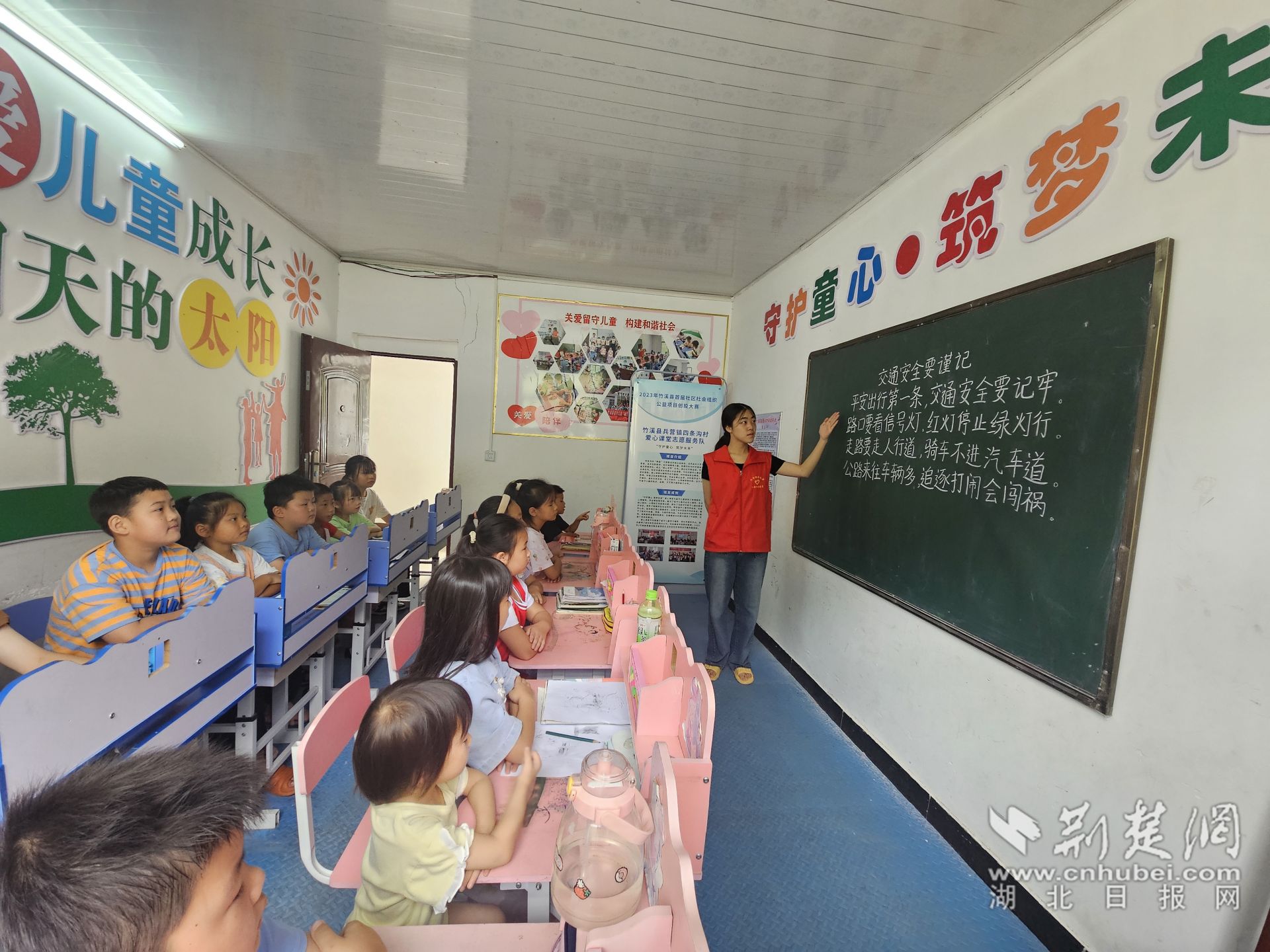 四條溝村的“愛心課堂”是由一間辦公室改造而成,里面有十張配套桌椅,一面長長的黑板,墻壁上掛著一條一條鼓舞人心的標(biāo)語,雖然小而擁擠,但吳亞萍覺得十分溫馨。
