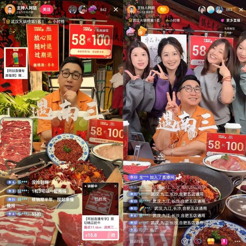 冬天到來,誰不想吃上一頓火鍋?11月14日晚,武漢知名主持人@主持人阿喆 就走進(jìn)武漢本地火鍋商家遇南三重慶火鍋,為抖音直播間觀眾們帶來了6折雙人餐等團(tuán)購福利。當(dāng)晚,直播間成交1.7萬張代金券,整場直播銷售額132萬元。