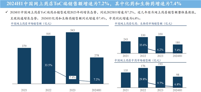 中國城市實(shí)體藥店藥物銷售略有下滑,同比增速為-1.9%,與2020-2022年相比增速有所回落。中國網(wǎng)上藥店ToC端藥品銷售延續(xù)2023年的增長態(tài)勢,同比增速為7.2%。近幾年因?yàn)榫W(wǎng)上藥店銷售額整體基數(shù)低,呈現(xiàn)快速增長態(tài)勢;其中化藥和生物藥銷售額同比增速為7.4%,中藥同比增速為6.8%。