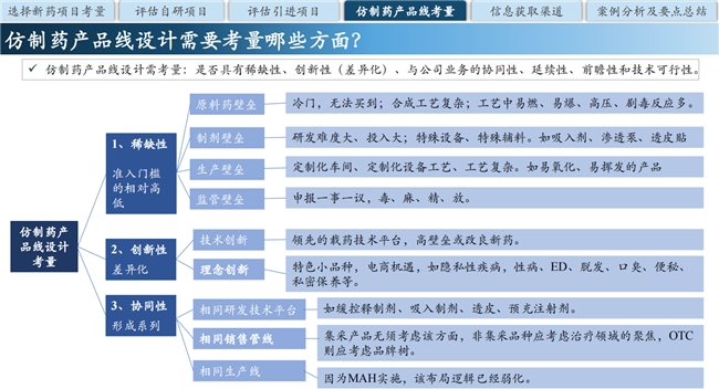 那么,如何評(píng)估擬自主立項(xiàng)的新藥或仿制藥項(xiàng)目呢?楊建云強(qiáng)調(diào),產(chǎn)品立項(xiàng)評(píng)估是企業(yè)戰(zhàn)略規(guī)劃的核心,也是推動(dòng)創(chuàng)新、優(yōu)化資源配置、提升競爭力的關(guān)鍵。對(duì)于新藥項(xiàng)目,應(yīng)從適應(yīng)癥、靶標(biāo)、研究方案及風(fēng)險(xiǎn)分析等四個(gè)方面進(jìn)行評(píng)估;而設(shè)計(jì)仿制藥產(chǎn)品線時(shí),則需考慮稀缺性、創(chuàng)新性、協(xié)同性、延續(xù)性、前瞻性和技術(shù)可行性等六大要素。