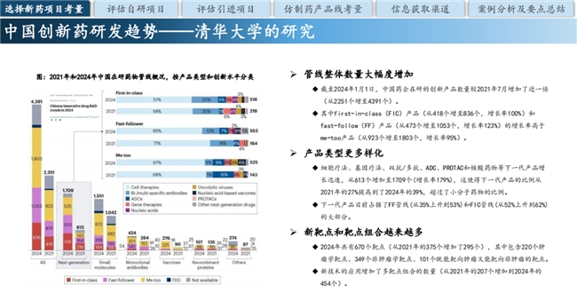楊建云指出,中國創(chuàng)新藥研發(fā)正呈現(xiàn)蓬勃發(fā)展的態(tài)勢。目前,中國已成為全球第二大新藥開發(fā)國家,創(chuàng)新藥占全球在研藥物的26.7%。全國約有1270家醫(yī)藥公司總部設(shè)在中國,僅次于美國。據(jù)摩熵?cái)?shù)據(jù)統(tǒng)計(jì)顯示,截至2024年1月1日,中國藥企在研的創(chuàng)新產(chǎn)品數(shù)量已從2021年7月的2251個(gè)增至4391個(gè),其中first-in-class(FIC)和fast-follow(FF)產(chǎn)品的增長率高于me-too產(chǎn)品。