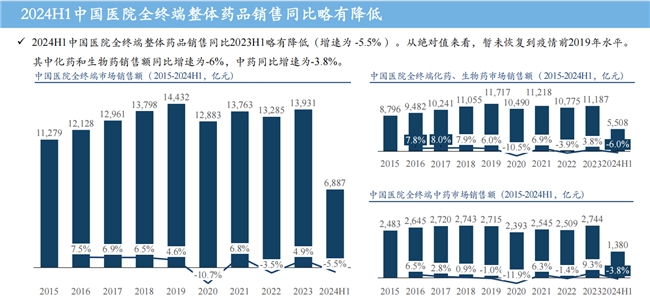 王博士從醫(yī)院全終端市場、實(shí)體藥店市場、網(wǎng)上藥店市場三個(gè)維度,對(duì)2024年上半年中國藥品市場銷售數(shù)據(jù)進(jìn)行了詳細(xì)解讀。據(jù)摩熵醫(yī)藥數(shù)據(jù)統(tǒng)計(jì),2024年上半年中國醫(yī)院全終端藥品銷售同比2023年上半年略有下降(增速為-5.5%),尚未恢復(fù)至疫情前2019年的水平。其中,化藥和生物藥銷售額同比增速為-6%,中藥同比增速為-3.8%。