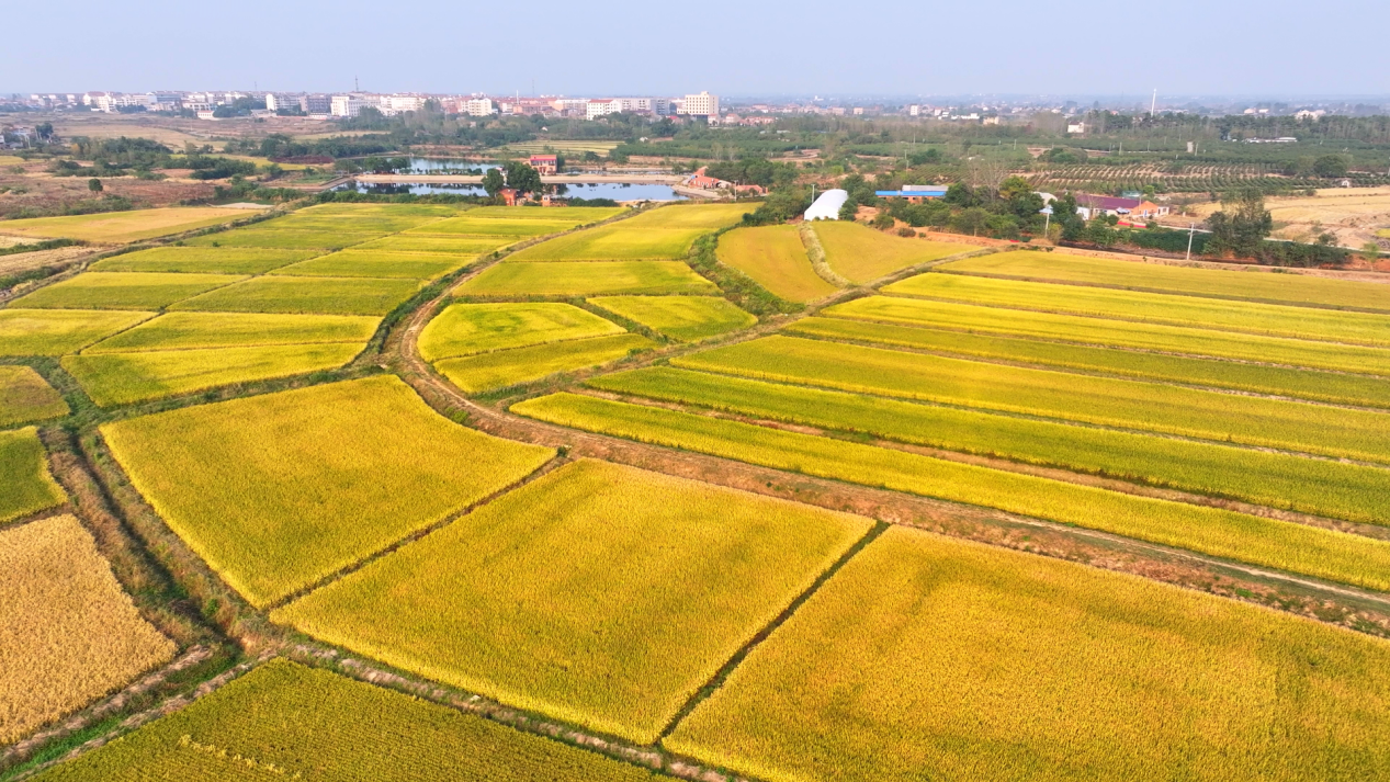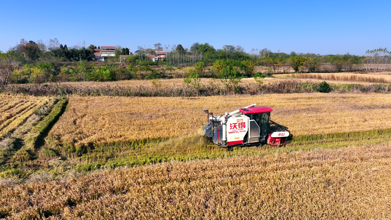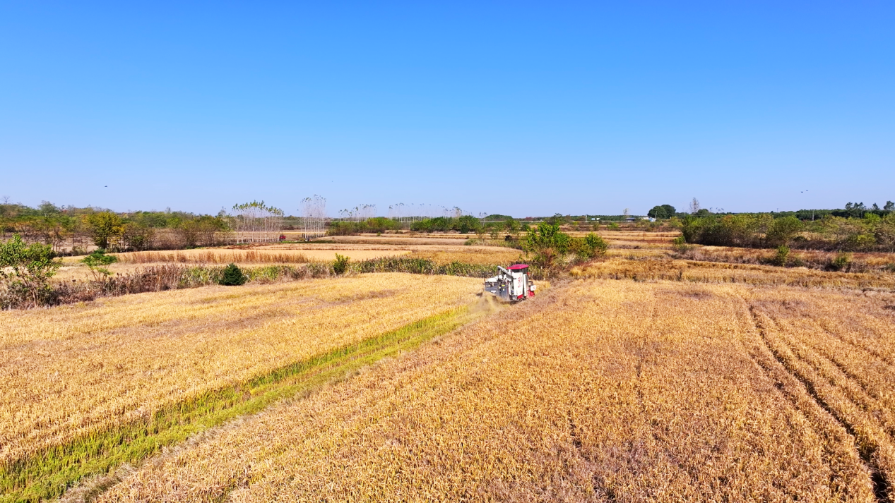 從高空俯瞰,孝昌縣鄒崗鎮(zhèn)的萬畝稻田與鄉(xiāng)村農(nóng)舍、藍天白云相互映襯,構(gòu)成一幅金光燦爛的美麗鄉(xiāng)村田園畫卷。連片水稻田隨風(fēng)搖曳,收割機在稻田來回穿梭,機身隆隆,一串串飽滿的稻穗卷入齒輪,收割、脫粒、吐桿、裝車,機械化收割一氣呵成,高效有序。