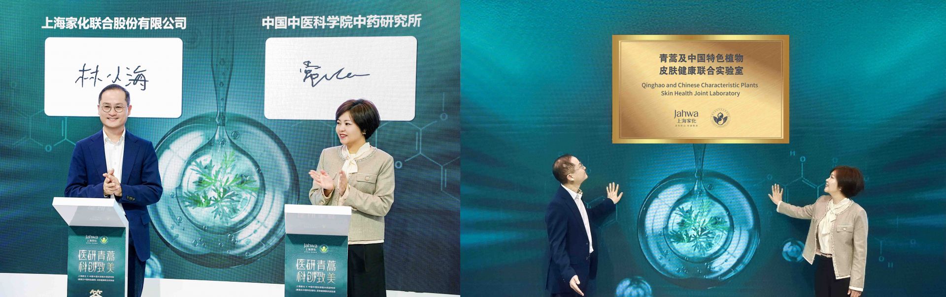 上海家化董事長兼首席執(zhí)行官林小海(左)、中國中醫(yī)科學院中藥研究所紀委書記常鵬飛(右)代表雙方簽署合作協(xié)議及啟動揭牌