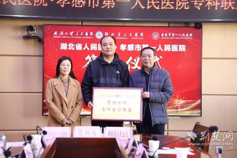 荊楚網(wǎng)(湖北日?qǐng)?bào)網(wǎng))訊(通訊員胡佳萍)11月28日,武漢大學(xué)人民醫(yī)院授予孝感市第一人民醫(yī)院“婦產(chǎn)科??漆t(yī)療聯(lián)盟”“胃腸外科??坡?lián)盟”和“林慧慶教授專家團(tuán)隊(duì)工作室”牌匾,并現(xiàn)場(chǎng)簽約,開啟兩院合作新篇章。