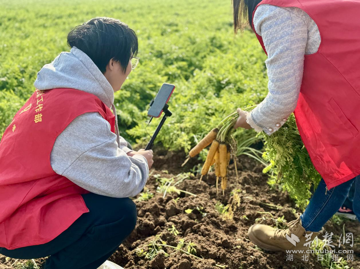 “我們現(xiàn)在所處的位置是應(yīng)城市城中街道周陳村,這是剛剛從田里挖出來的胡蘿卜,天然無污染!”直播鏡頭前,一壟壟“黃玉”胡蘿卜長勢(shì)喜人,主播們現(xiàn)場采摘、試吃,向直播間的網(wǎng)友們介紹胡蘿卜的品質(zhì)和口感。