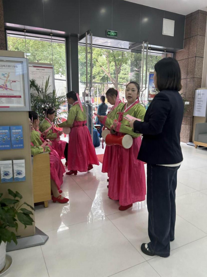 在排練等待的間隙,工作人員熱情地邀請(qǐng)參賽者和觀眾進(jìn)入銀行廳堂。理財(cái)經(jīng)理與業(yè)務(wù)經(jīng)理提前將近期多發(fā)的詐騙案例進(jìn)行了精心總結(jié),并打印成通俗易懂的宣傳紙,分發(fā)給每一位到場(chǎng)群眾。