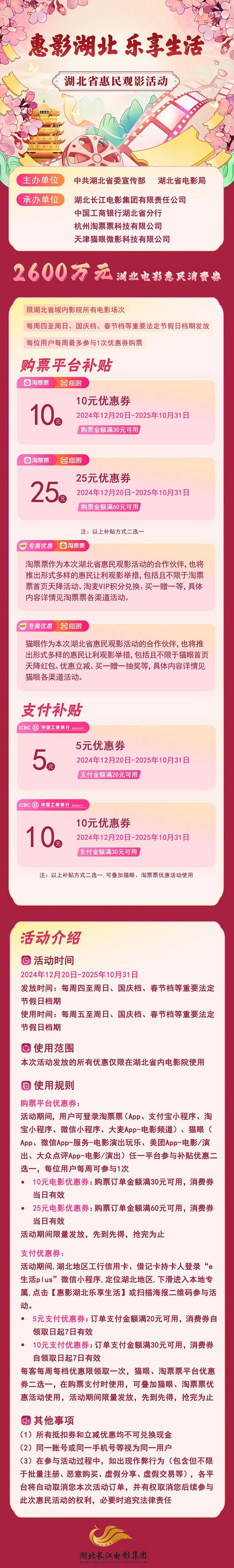 本次“惠影湖北 樂享生活”湖北省惠民觀影活動由中共湖北省委宣傳部、湖北省電影局主辦,湖北長江電影集團(tuán)有限責(zé)任公司、中國工商銀行湖北省分行、杭州淘票票科技有限公司、天津貓眼微影科技有限公司承辦。