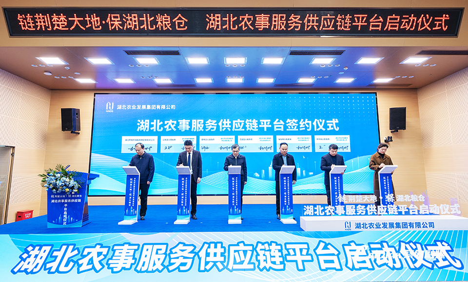 荊楚網(wǎng)(湖北日報網(wǎng))訊 (通訊員周雄、吳亭 、李偉恩、付琪)12月21日,湖北農(nóng)事服務供應鏈平臺啟動儀式在湖北農(nóng)發(fā)科研大樓舉行。湖北農(nóng)發(fā)集團黨委書記、董事長朱萬奎和蔡甸區(qū)委書記余從斌,共同為湖北農(nóng)發(fā)農(nóng)事服務供應鏈有限公司揭牌,標志著湖北農(nóng)事服務供應鏈平臺正式啟動運營。湖北農(nóng)發(fā)集團總經(jīng)理楊良鋒出席啟動儀式并致辭。