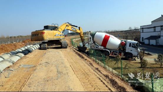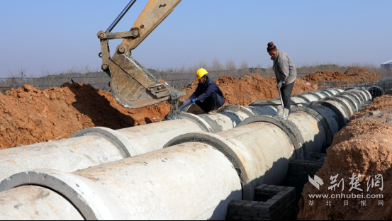 在孝昌縣鄒崗鎮(zhèn)滾子河流域治理項目施工現(xiàn)場,大型機械設(shè)備轟鳴作響,熟練地將水泥運送到溝渠的涵管處,工人配合默契,緊張有序地往涵管接縫處進行灌漿。目前,該村2.72公里的引水渠修復(fù)工程正在加緊施工。
