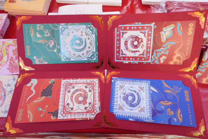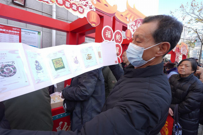 活動(dòng)現(xiàn)場(chǎng)還專門設(shè)置了展銷集市,生肖文化展示區(qū)不僅有蛇年郵票、賀年封、明信片等產(chǎn)品,還陳列著歷年生肖郵票展品,系統(tǒng)展現(xiàn)生肖文化發(fā)展脈絡(luò);蓋戳打卡區(qū)人潮涌動(dòng),集郵愛(ài)好者們精心為新購(gòu)郵票加蓋特色郵戳,珍藏這一特殊時(shí)刻;金融權(quán)益區(qū)的工作人員為居民免費(fèi)辦理社??ā岸鷵Q三代”,并悉心講解金融知識(shí),提供專屬權(quán)益服務(wù);渠道年貨展銷區(qū)現(xiàn)場(chǎng)銷售酒水、堅(jiān)果禮包、臘貨特產(chǎn)禮盒等春節(jié)必備年貨,方便周邊居民和集郵愛(ài)好者可以現(xiàn)場(chǎng)“打年貨”,活動(dòng)氛圍十分濃厚。