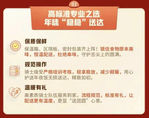 比如年夜飯場景中,精致復(fù)雜的年菜不斷推陳出新,給配送逐漸“上難度”。對于承載著家人團聚、辭舊迎新情感的重要一餐,順豐同城采用嚴(yán)格的配送標(biāo)準(zhǔn),保溫箱、區(qū)隔板、密封包裝齊上陣,裝載配送過程中穩(wěn)妥放置、輕拿輕放,確保精細(xì)食材、精致擺盤完好如初,將名廚招牌菜、“功夫菜”原汁原味地送到家庭餐桌。同時,順豐同城還靈活利用三輪車和四輪車等多元彈性運力進(jìn)行接駁,以應(yīng)對不同體量、不同距離的年夜飯配送需求。