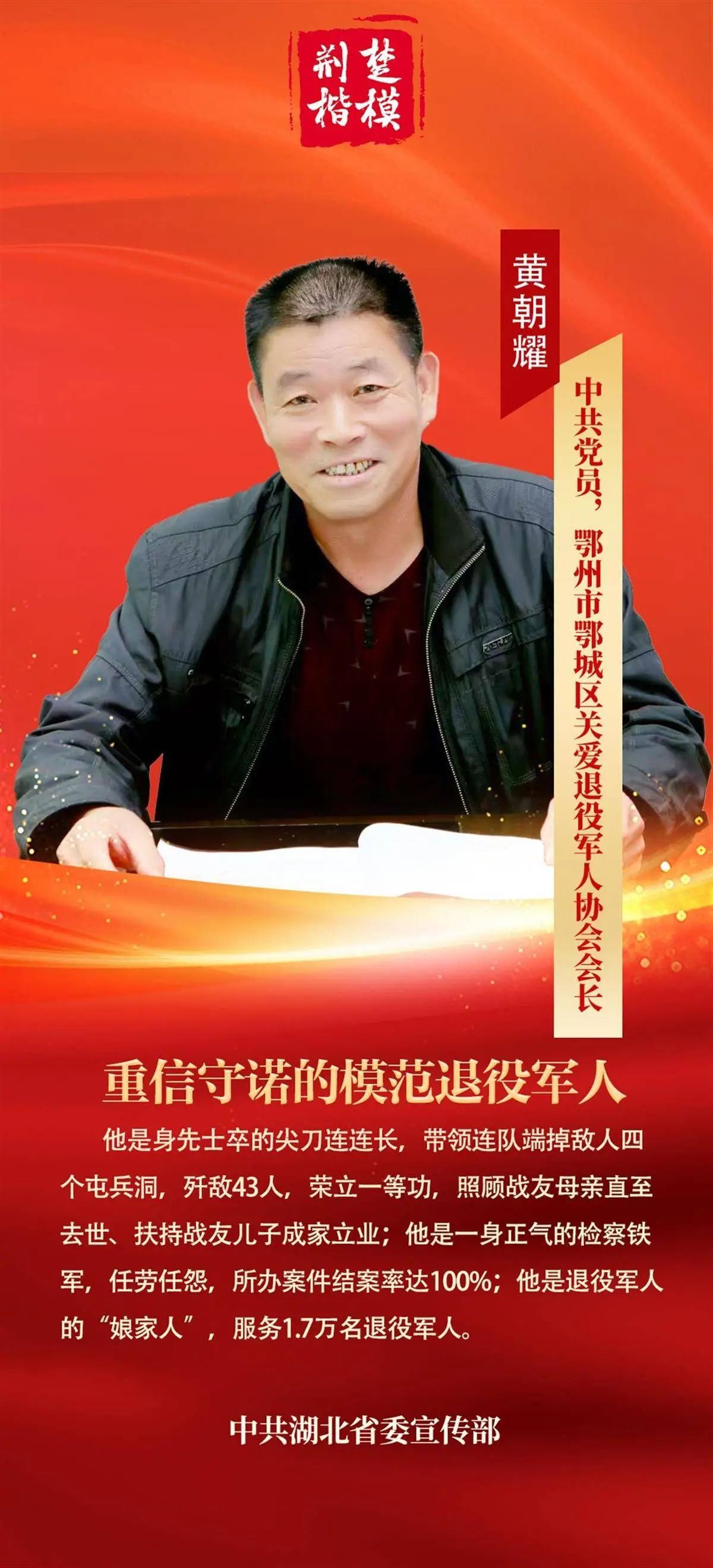 “荊楚楷模”關(guān)于黃朝耀的頒獎詞為:他是身先士卒的尖刀連連長,帶領(lǐng)連隊端掉敵人四個屯兵洞,殲敵43人,榮立一等功,照顧戰(zhàn)友母親直至去世、扶持戰(zhàn)友兒子成家立業(yè);他是一身正氣的檢察鐵軍,任勞任怨,所辦案件結(jié)案率達100%;他是退役軍人的“娘家人”,服務(wù)1.7萬名退役軍人。2024年,他榮獲“全國模范退役軍人”榮譽稱號。