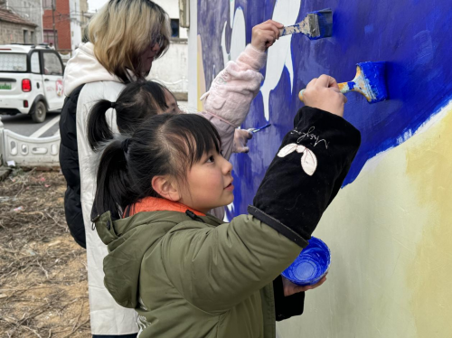 當(dāng)?shù)貧鉁剌^低,志愿者一整天都在室外作畫,耳朵、臉頰和雙手被凜冽的寒風(fēng)凍得通紅,高舉作畫的手臂肌肉酸痛,鋪在地上的防塵膜常被寒風(fēng)吹起,志愿者們一次又一次耐心、細(xì)心地鋪平,又仔細(xì)地將顏料桶里的灰塵、木屑等垃圾清理出來。盡管是如此艱苦的條件,志愿者們?nèi)砸唤z不茍地完成每一面墻繪作品。當(dāng)?shù)責(zé)嵝拇迕窨吹街驹刚邆內(nèi)绱苏J(rèn)真,向志愿者們提供了許多力所能及的幫助。同時臨近寒假,周邊的孩子們每天一放學(xué)就加入墻繪的隊伍,在志愿者們的指導(dǎo)下拿起畫筆描繪心中長江美景,為墻繪增添童真,讓環(huán)保理念深入人心。
