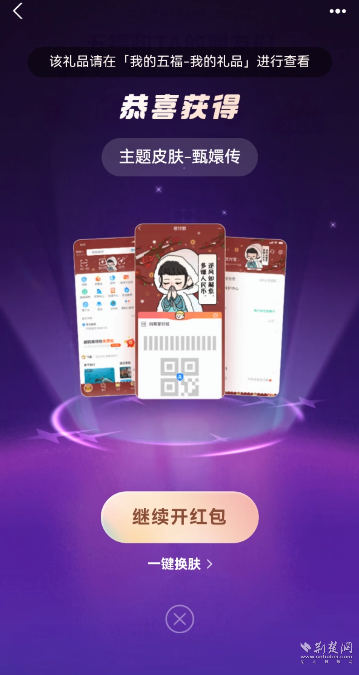 記者大約掃了六七次,就輕松集齊4張卡,合成后獲得了“甄嬛傳”主題的支付寶app的皮膚,領(lǐng)取紅包“開(kāi)啟下一關(guān)”,則可以繼續(xù)闖關(guān)合成開(kāi)獎(jiǎng)。開(kāi)獎(jiǎng)不用等到除夕,并且可以一直集福到大年初五,這也是今年集福最大的變化之一。